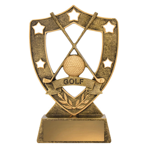 Classic wreath and shield inspired design, the Golf Trophy Gold Shield is an affordable and popular award choice. The trophy series features the traditional crossed Golf clubs theme and is available in 3 convenient sizes.