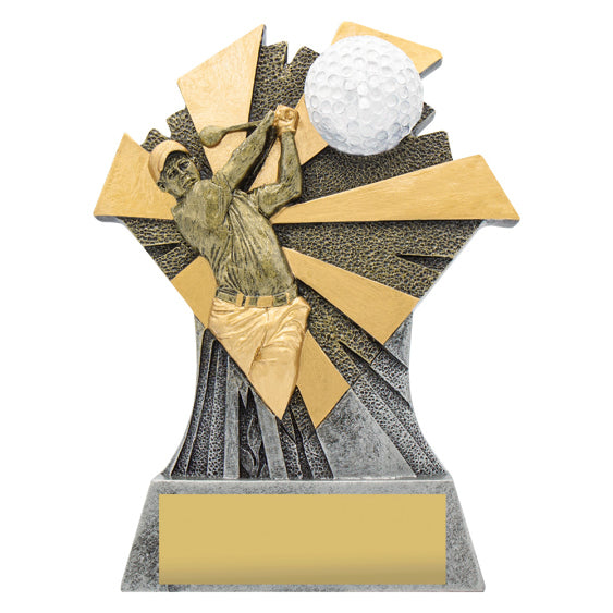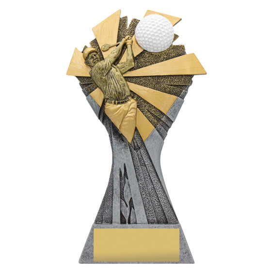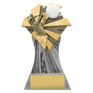 The Smash Series for Golf is a substantial award, a sculptured trophy line featuring a golf player and a golf ball in motion against a dynamic backdrop. Finished in gold and silver and available in 3 great sizes.